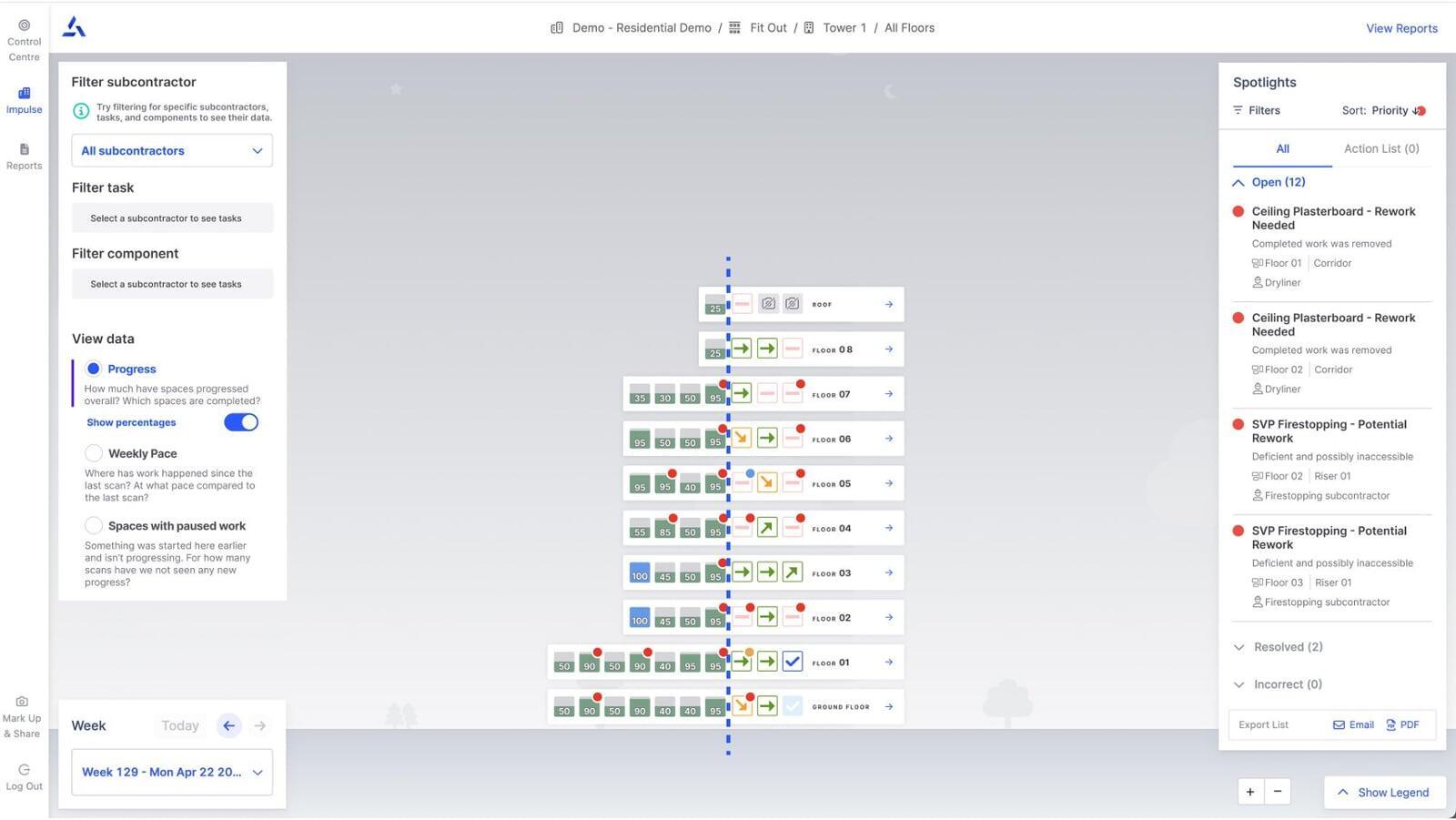 See project health at a glance with key insights and trends, with easy drill-down into details. Track progress across trades and tasks, quickly accessing status updates and relevant images. Spotlights, our early-warning system, detects issues early to prevent costly rework and delays.
